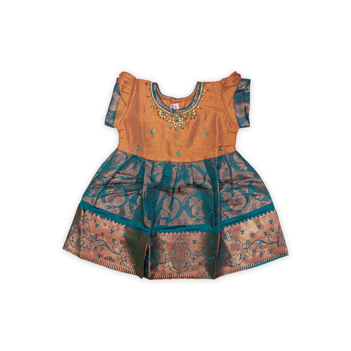 View full details“Adorn your baby girl in the colors of tradition – where Varanasi weaves meet the charm of a festive frock dress.” • This exquisite frock dress in...