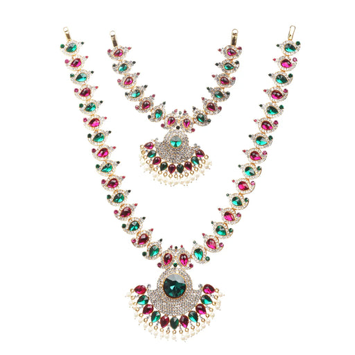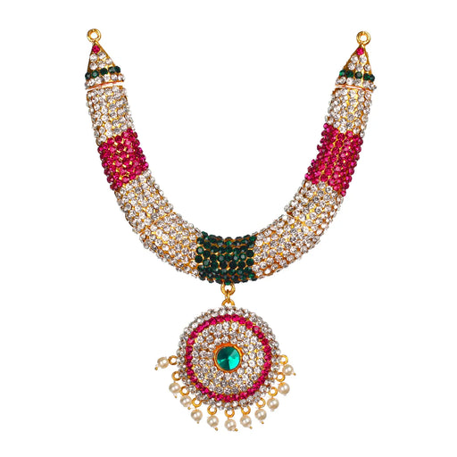 View full details• Enhance your pooja setup with this vibrant multi-colour stone Deity Necklace, designed to highlight the divine beauty of your idol during festiva...