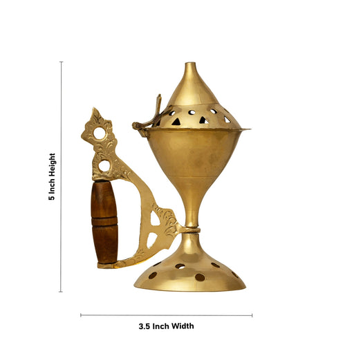 Dhoop Stand With Wooden Handle - 5 X 3.5 Inches | Dhoop Batti Stand/ Brass Sambrani Stand With Lid For Pooja