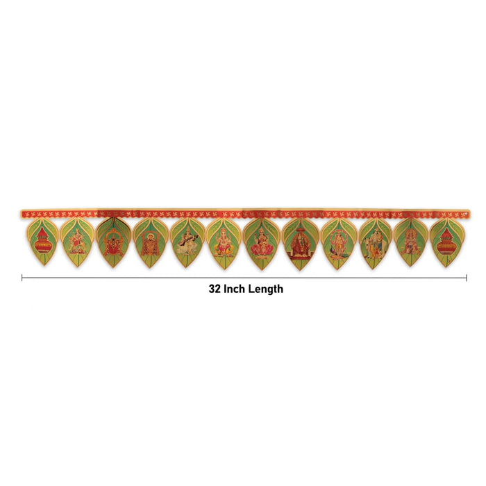 • The god pictures on the thoranam leaves include Lord Ganesha, Lord Murugan, and Goddess Lakshmi, among others. The graphics are intended to be eye-catching and are printed in brilliant colors, making them stand out against the green backdrop of the mango leaves.